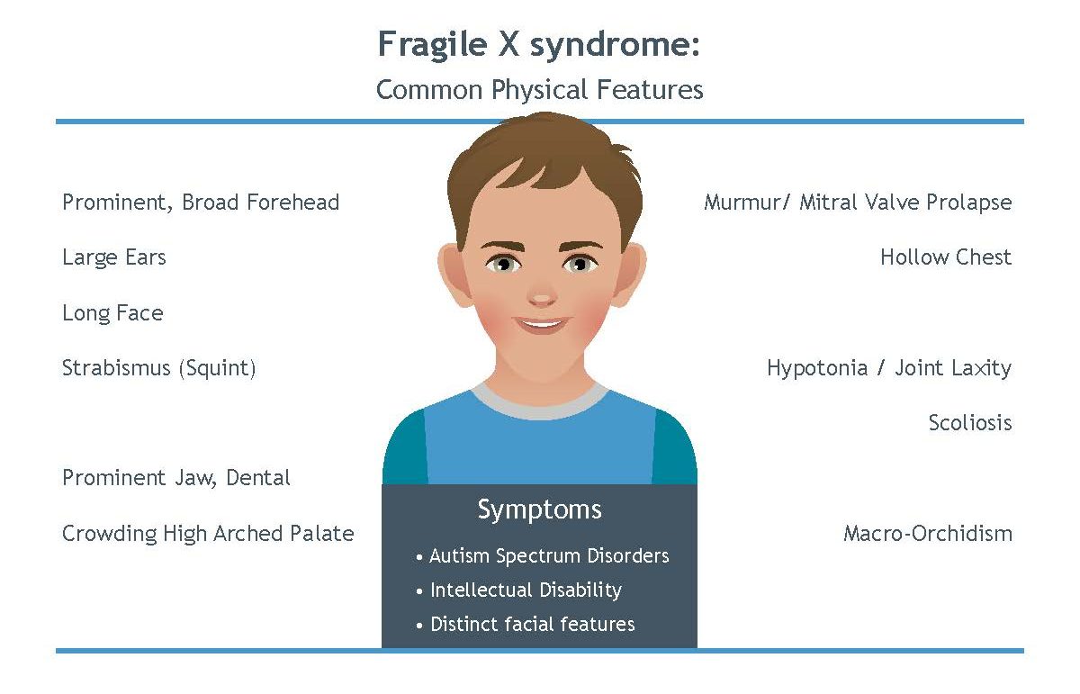 Fragile X syndrome is an inherited, genetic disorder associated with a wide range of symptoms, including learning and behavior challenges. Children and adults with fragile X syndrome can have difficulty learning and intellectual disability. Speech and language is often delayed in young children until they are at least two years old. People who have fragile X syndrome may also have autism spectrum disorder or autistic-like behaviors such as anxiety, attention-deficit disorder (ADD), and attention-deficit hyperactivity disorder (ADHD). Autism is complex, and people with autism may have difficulty with communication and relating to others. Physical features that are often associated with fragile X syndrome are: