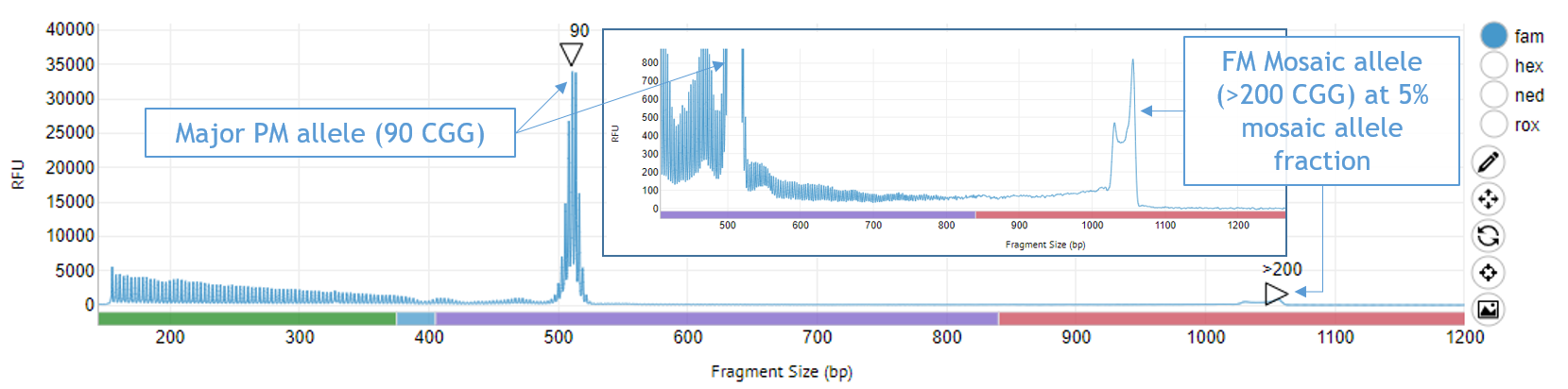 - Detection of challenging allele expansions — including low abundance full mutation size mosaics — provides more sensitive and accurate diagnosis of Fragile X