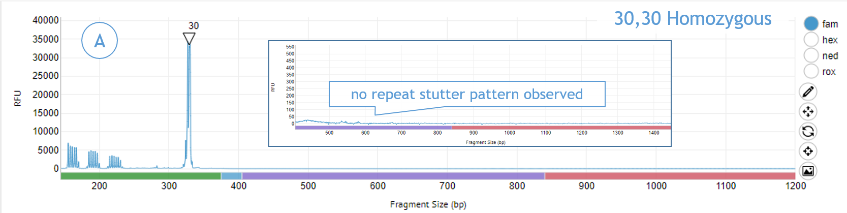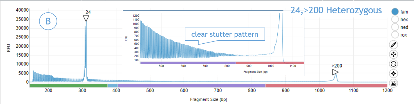 Figure 2. Clear, visual resolution of zygosity via repeat primer (“stutter”) peak pattern. A) Shows a sample with a homozygous 30/30 CGG call. No stutter pattern is present after the gene-specific peak, indicating no further peaks are present. B) Shows a heterozygous sample with a heterozygous 24/> 200 CGG call. There is a marked stutter peak pattern after the first gene-specific peak (24), indicating the presence of another gene-specific peak (>200).